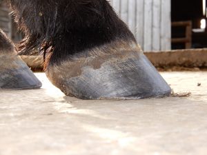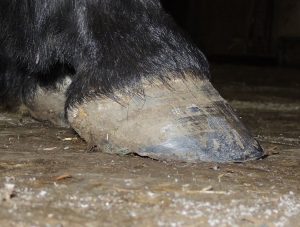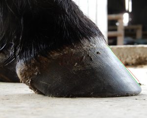 The first visit by an EP was in November 2016, after the shoes had been pulled by the owner’s farrier. On the initial visit the horse was short striding and landing toe first in walk with a mild lameness in trot on concrete that was less obvious on the arena surface. His toes were run forward and heels under run with weak soft tissues in the palmar (back of the) foot. During the initial trim, it was noted that the horse found it very difficult to protract (lift) his right fore to place it on the hoof stand for wall dressing. A recommendation was made to include a registered equine physiotherapist in the treatment plan and begin hand walking on a soft surface over poles 3x per week, to start to encourage a longer stride length.